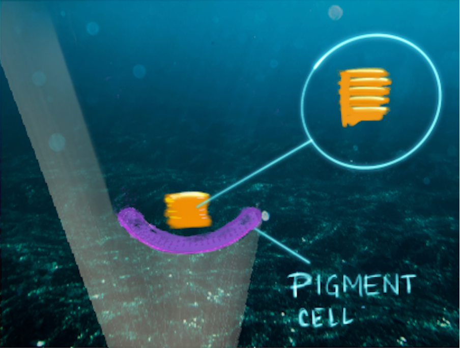 Millions of years have passed, and, among other innovations, Jonas has gained a pigment cell. This cell acts as a screen, absorbing light and shielding one side of the light-sensitive cell.